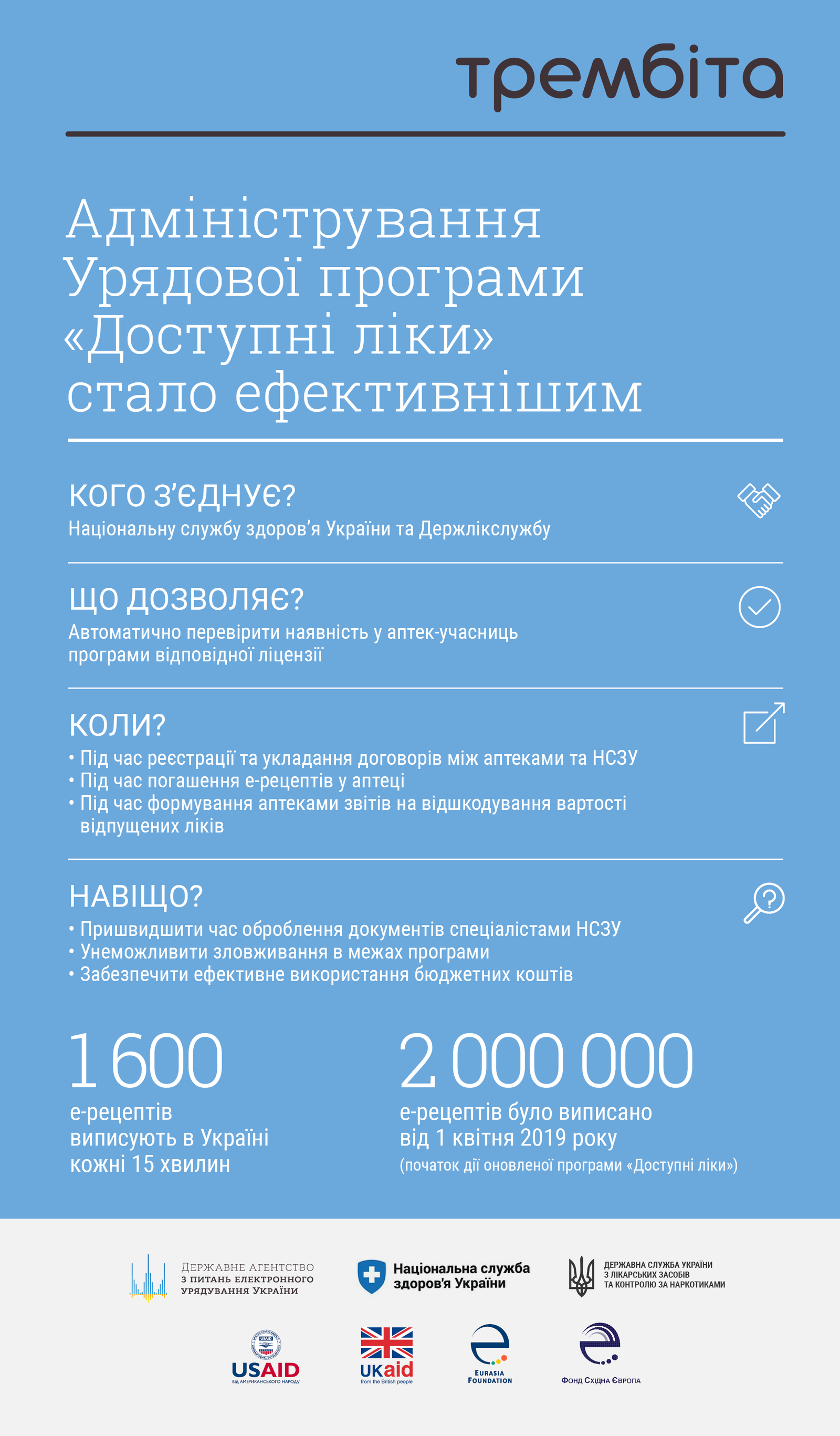 Нагадаємо, що «Трембіта» – це система електронної взаємодії державних реєстрів та баз даних, що дозволяє відомствам та органам влади безпечно та оперативно обмінюватися необхідною інформацією для більш якісної взаємодії як між собою, так і з громадянами та представниками бізнесу. Окрім того, «Трембіта» надає можливість створювати для населення більш якісні послуги – як офлайнові, так і електронні.
